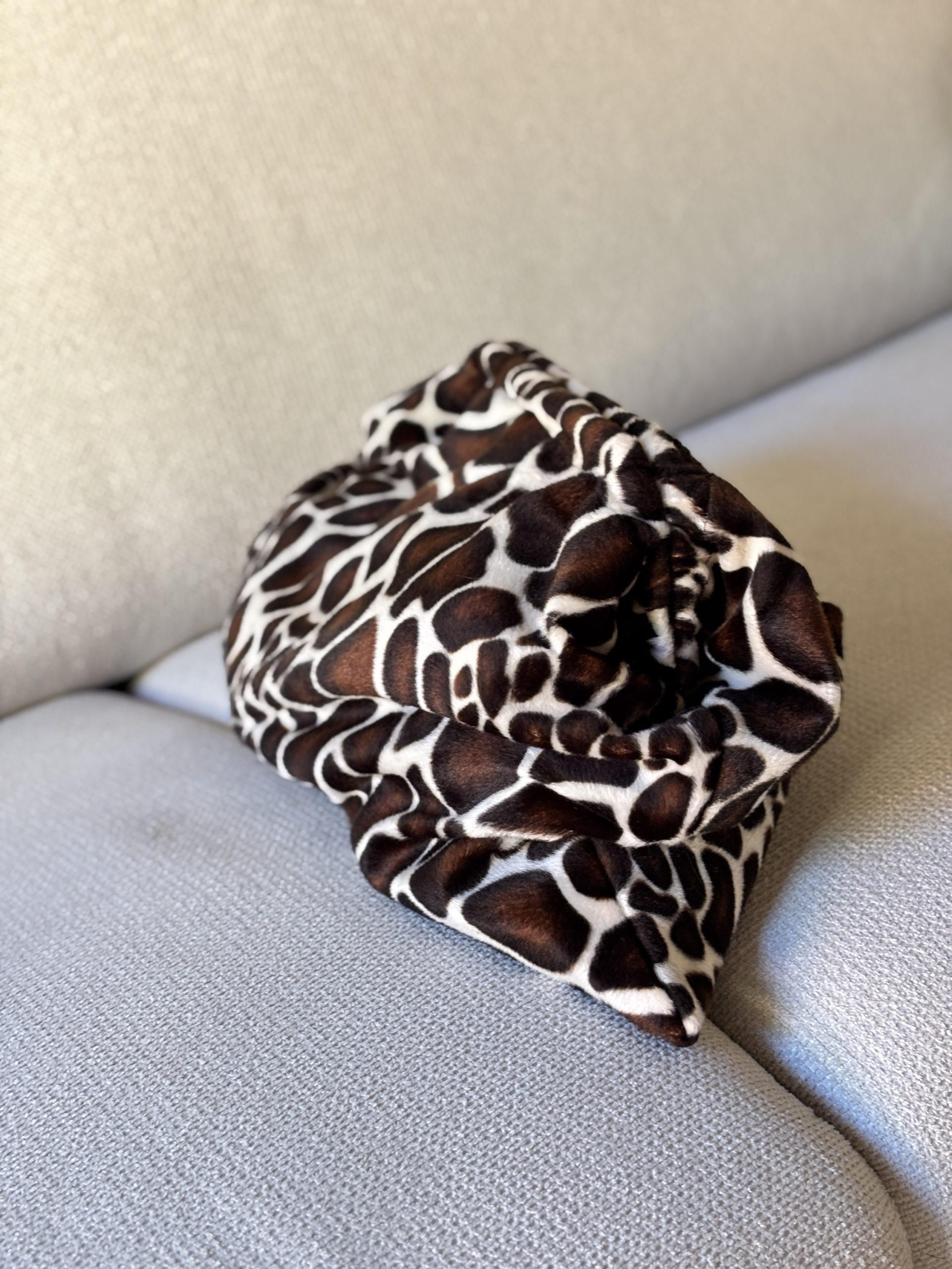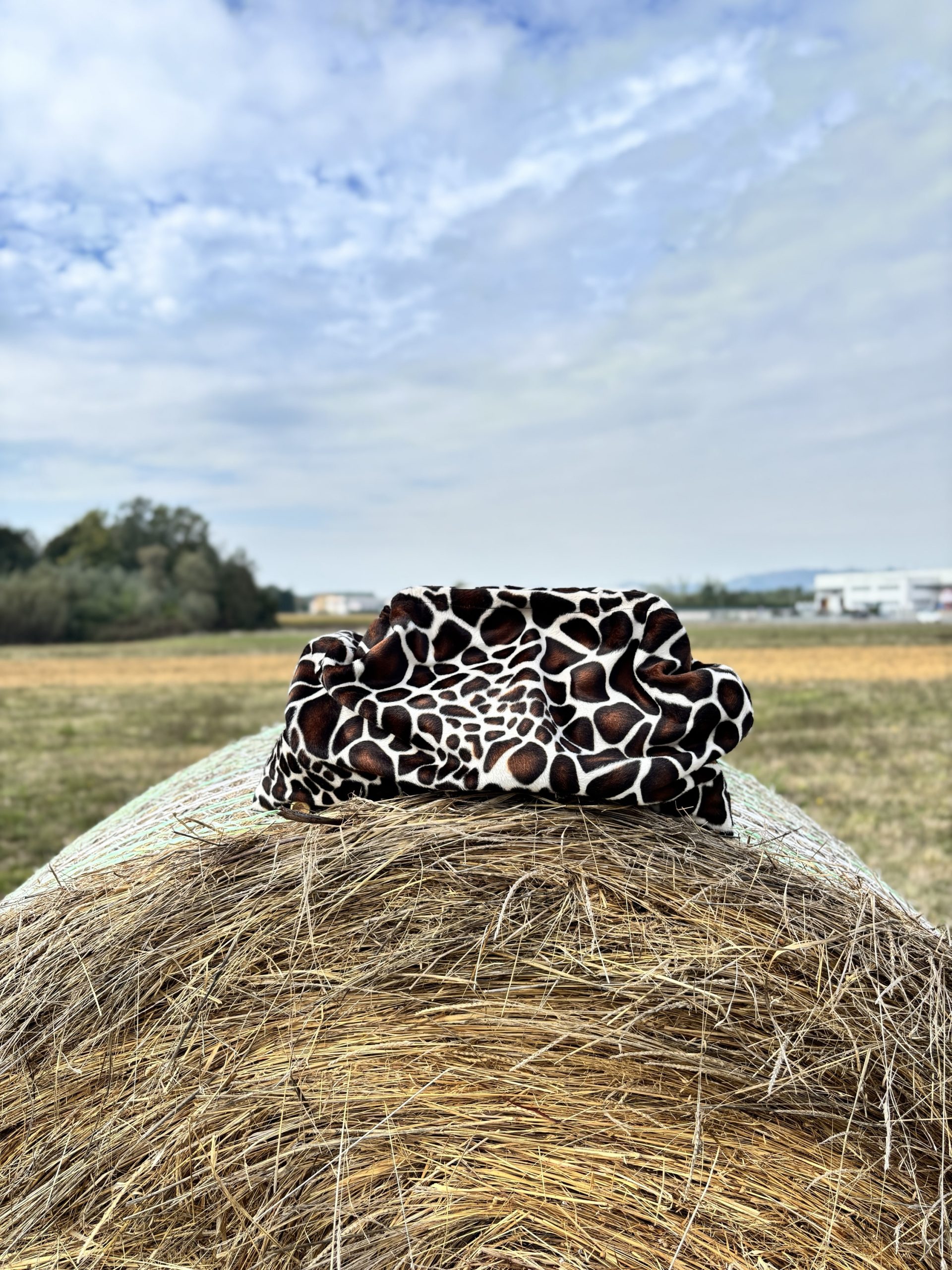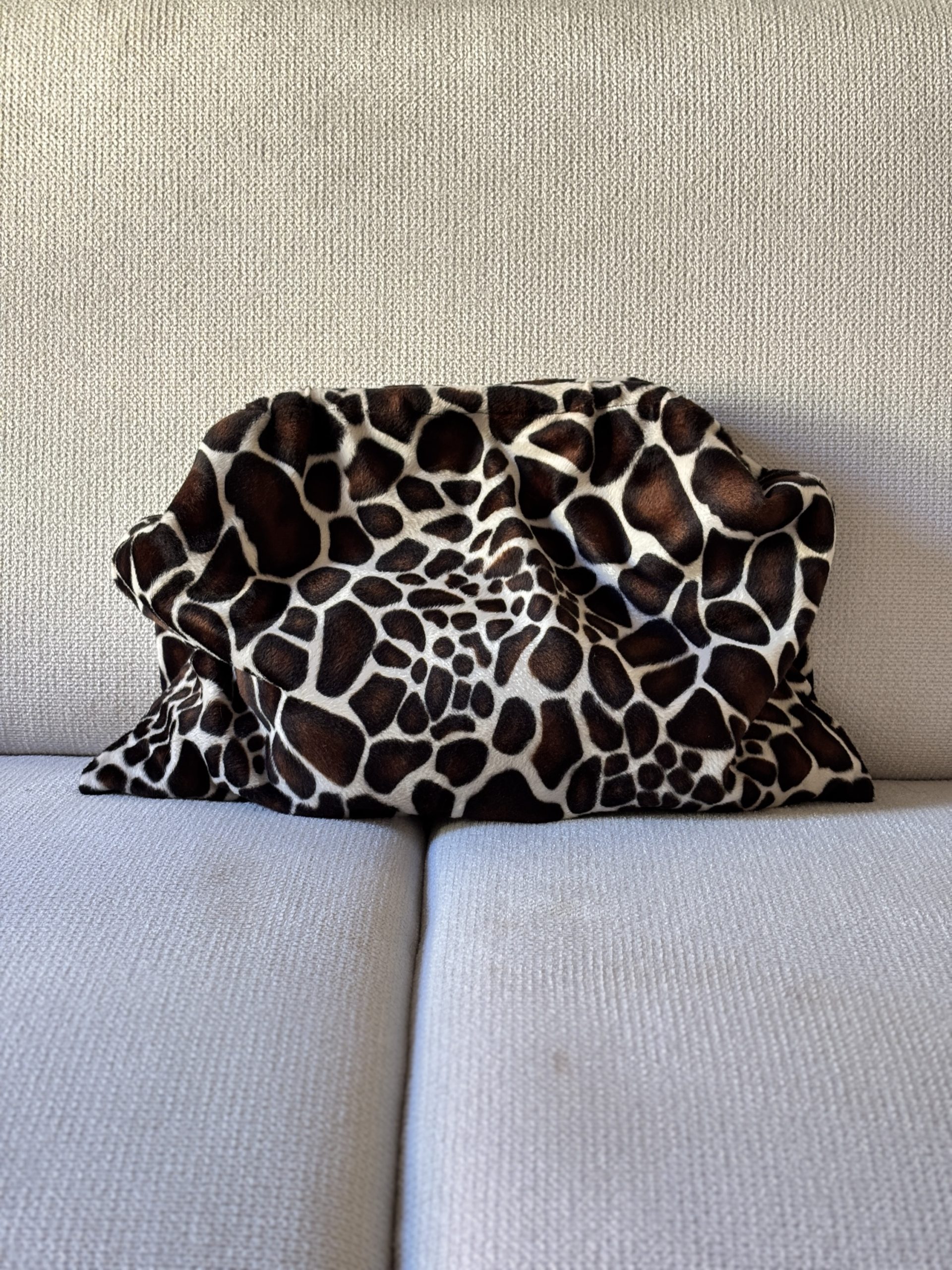 Realizzata in morbido tessuto effetto cavallino in stampa giraffa, foderata, questa borsa è un inno alla forza e all’autenticità.